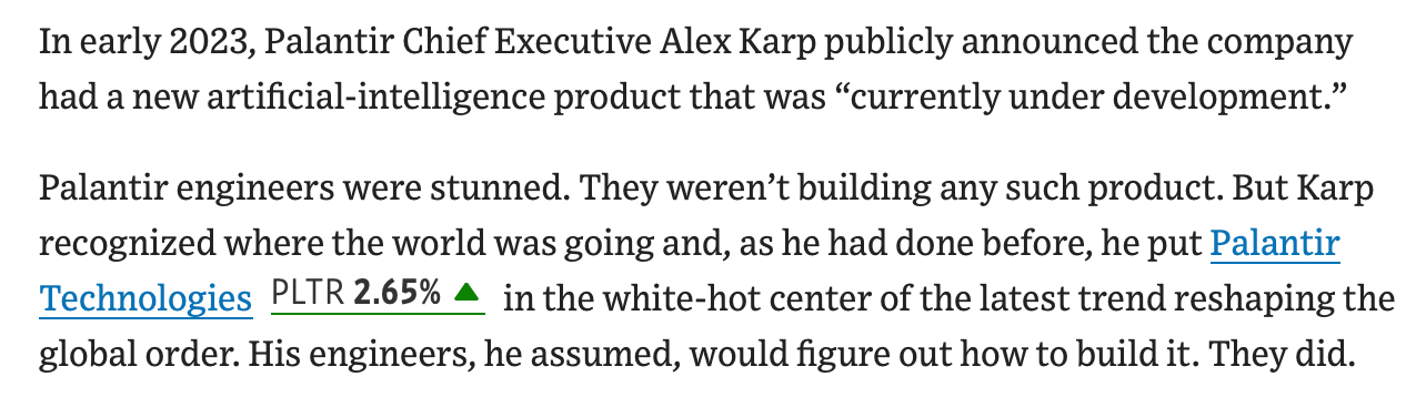 Narrative before reality, as if Bhaskar predicted this story in the WSJ from yesterday: How Palantir Won Over Washington—and Pushed Its Stock Up 600%