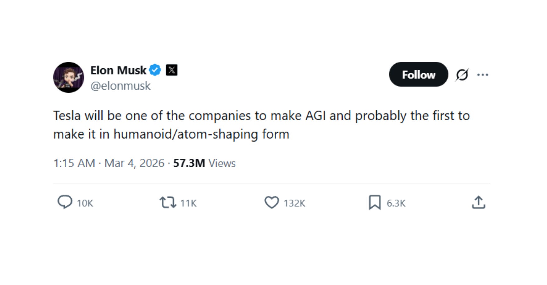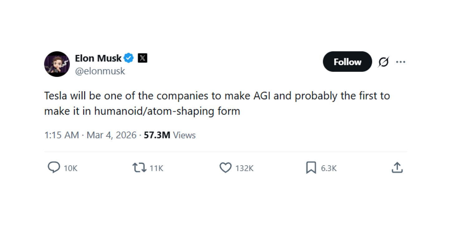 That student missed a lot. Savitt began by tying Musk in knots. He mentioned a passing comment from Musk’s earlier testimony, when he said, “No, Tesla is not pursuing AGI. It’s literally trying to make a car drive from A to B.” Savitt pulled up an X post from Musk, dated March 4, 2026: “Tesla will be one of the companies to make AGI and probably the first to make it in humanoid/atom-shaping form,” he wrote. The best rebuttal Musk could muster is that Tesla will be pursuing AGI in the future, which is different from pursuing it in the present-tense.