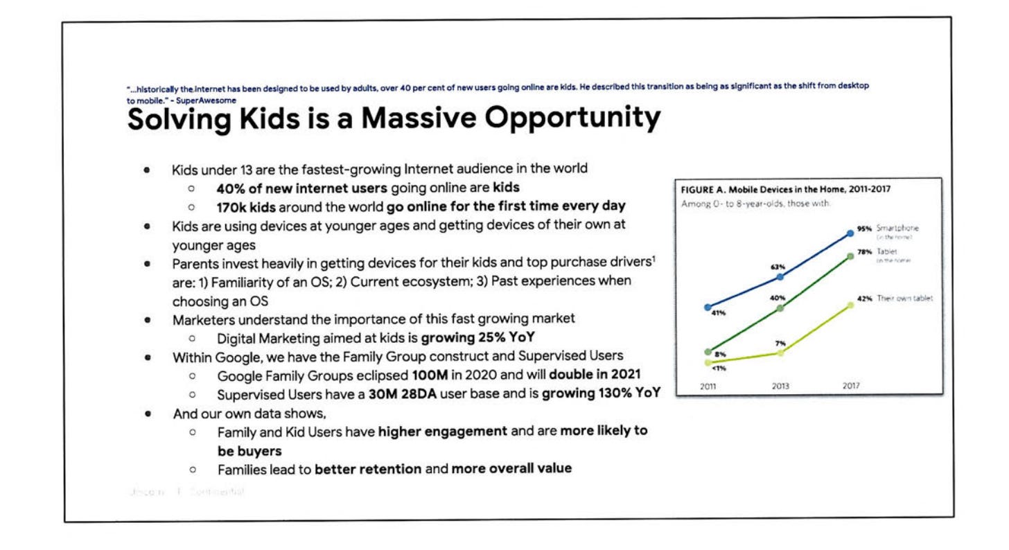 A November 2020 presentation entitled “Business Case for Kids and Families at Google” is full of remarkably blunt takeaways penned by a redacted product manager. A slide called “Solving Kids Is a Massive Opportunity” included a statistic that “kids under 13 are the fastest-growing internet audience in the world.” It mentioned that 170,000 children go online for the first time every day, and that they’re largely doing so on mobile devices.