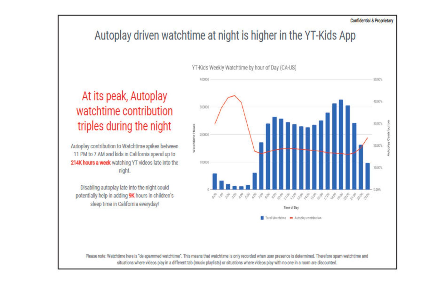 The next slide of the presentation noted that autoplay-driven watchtime was even higher among kids. In California alone, children logged up to 214,000 hours per week of late-night watchtime. If autoplay was disabled at night, California children would gain back roughly 9,000 hours of sleep time per day, according to the presentation. The “verdict” slide of the presentation concluded that autoplay “could be potentially disrupting sleep patterns,” and “disabling or limiting autoplay during the night could result in sleep savings.”