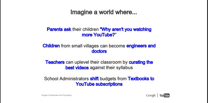 The image below really speaks for itself; all I’ll add is that as best I can tell, it’s from an early-2010s slide deck, when YouTube’s education incursion was in its infancy.