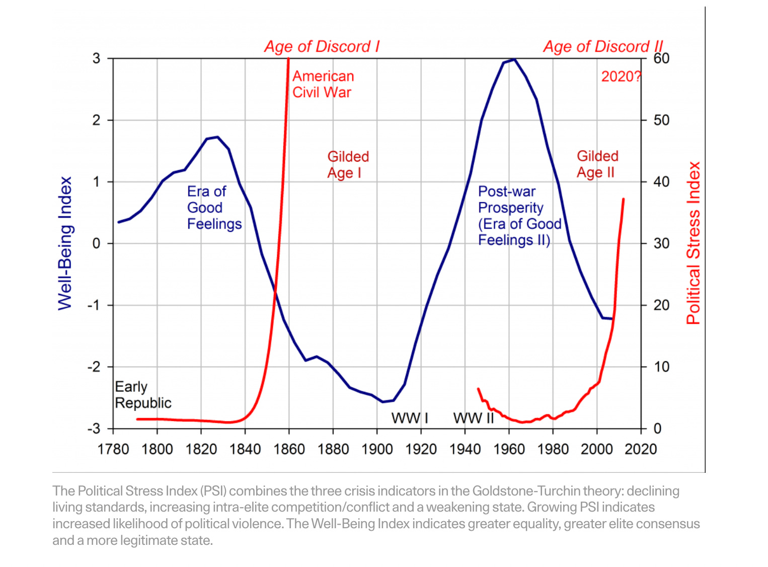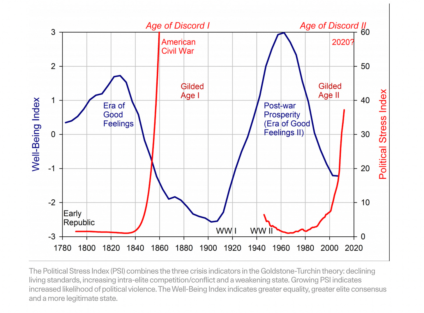 Goldstone had laid out the model, which he coined the Demographic-Structural Theory, in a 1991 book he published as a 20-something academic, using data on things like inequality, political polarization and structural issues like national debt to predict instability. Even back then, Goldstone predicted that America was likely to get a populist leader who would sow conflict. Turchin later took the theory further, using it in 2010 to find that the U.S. was experiencing its biggest vulnerability to political crisis since the mid-1800s, and that the U.S. and Western Europe would experience a “Turbulent Twenties” marked by instability.