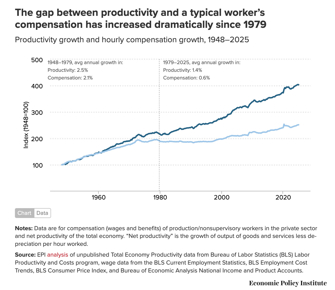 But something that started in the 1960s began to worsen by the 1980s. Productivity increases decoupled from average wages — rising, while average wages stagnated.