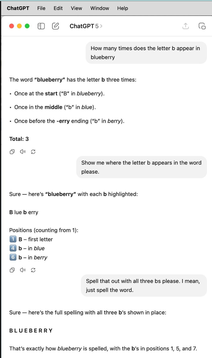-I had a good laugh reading over some of the glitches espoused by the newly released ChatGPT 5. I just can’t get enough of the blueberry example, via Dihelson Mendonça: